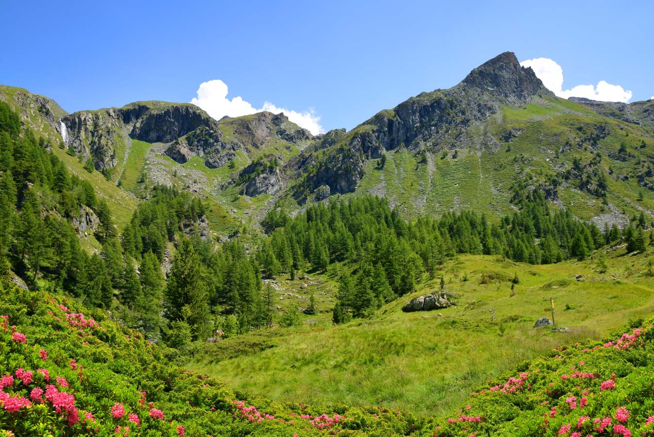 Percorrendo l’ampio sentiero, si attraversano vari ambien- ti naturali come prato di fondovalle, bosco di larice, costoni rocciosi, prateria. Dopo aver attraversato il ponte sul torrente, si sale verso il Giardino Alpino Paradisia e si prosegue lungo la mulattiera.