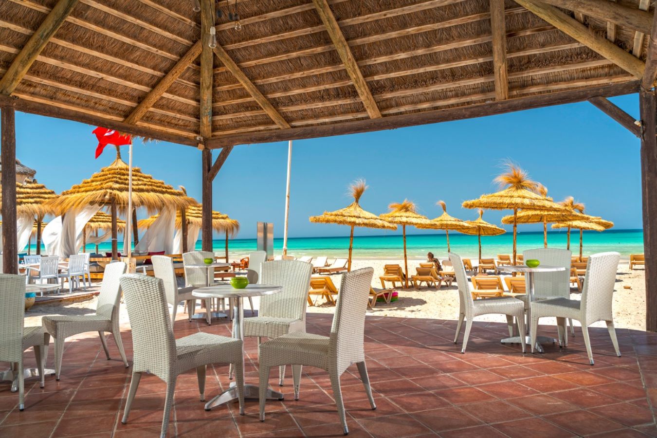 Ristorante principale Ulysse con servizio a buffet e chef italiano, 3 ristoranti à la carte aperti per cena e su prenotazione, possibilità di cenare una volta a soggiorno in uno dei tre: Omar Khayam con specialità della cucina tunisina, Alcazar dove poter gustare piatti della cucina mediterranea e El Kastel con specialità di pesce (aperto a luglio e agosto), uno snack alla spiaggia La Marsa, aperto da giugno a settembre per pranzi leggeri. La cena di Ferragosto è inclusa nella formula. Bar in spiaggia Le Phare (da giugno a settembre), piano bar Le Swing (a pagamento bevande internazionali di marca), bar piscina L’Oasis, bar principale Le Meninx, caffè moresco Halfaouine con terrazza tipica dove poter degustare dell’ottimo tè (altre consumazioni a pagamento), disco bar Adonis (a pagamento).